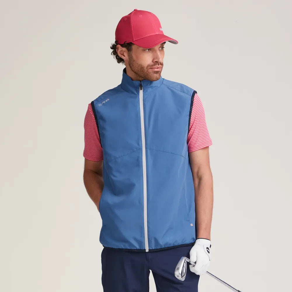 Precision möter stil i Burford Herrväst med Hel Dragkedja i Marinblått. Designad för golfare som kräver prestanda, har den vindtätt skydd och ett texturerat quiltat foder för andningsbar värme. Komplett med PING-märkning och två dragkedjeförsedda fickor för bekvämlighet. Perfekt för att bibehålla rörlighet och komfort under rundor i kallt väder eller utomhusaktiviteter.